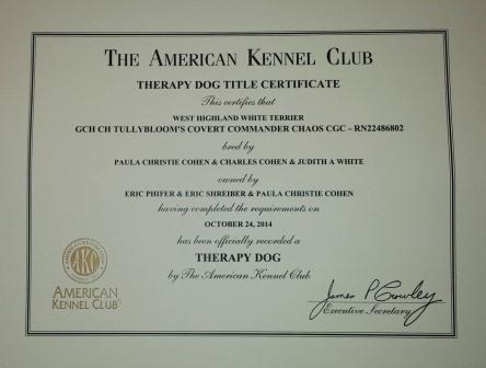 he changed residences and parents in 2013, Commander (GCH CH TullyBloom's Covert Commander Chaos, CGC, ThD) earned his AKC Therapy Dog title in October under the training and guidance of owners Eric Phifer and Eric Shreiber (Commander